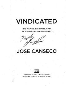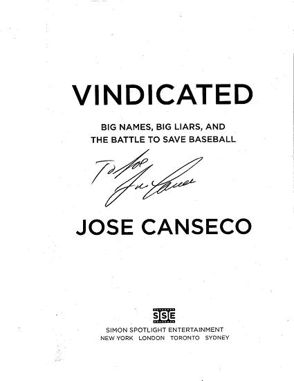 Update: Yes, that is Jose Canseco's signature above. He signed my copy last week at a Boston book signing. The man is gigantic, so I decided not to tell him that he was signing the first sold copy.